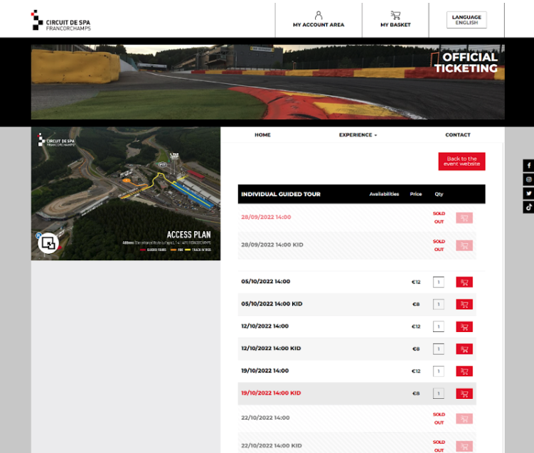 Le Circuit de Spa-Francorchamps est l'hôte de différents événements sportifs pour lesquels il commercialise lui-même les tickets, notamment : pour le retour de l'endurance moto sur le Circuit en 2022 avec les 24H SPA EWC Motos, le Benelux World Rallycross of Spa-Francorchamps et les Public Driving Experience (pour les amateurs). Pour cet ensembe d'événements, le Circuit avait besoin d'une solution digitale pour la gestion générale de la commercialisation de ses e-tickets dans un laps de temps très serré étant donné la promotion de certains événements.