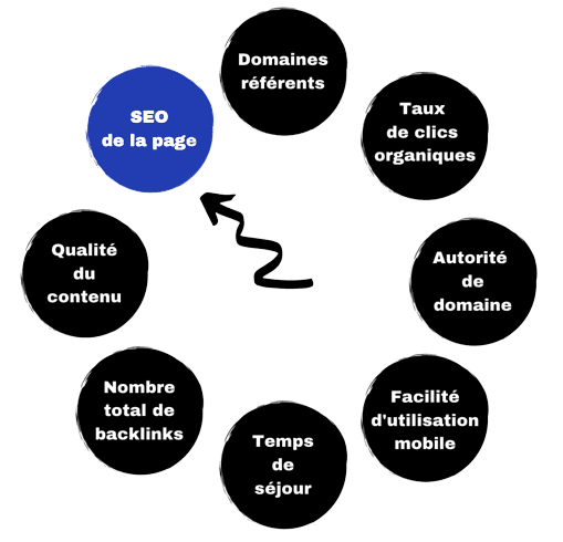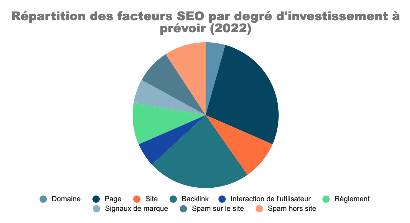 Les facteurs SEO sont répartis en neuf catégories (domaine, page, site, backlink, interaction de l'utilisateur, règlement, signaux de marque, spam sur le site et spam hors du site). La bonne gestion ou non de ces catégories va impacter l'algorithme Google servant à calculer l'ordre d'apparition des sites sur son moteur de recherche, et donc votre classement personnel direct. Comme vous pourrez le découvrir dans le graphique ci-après, la catégorie nécessitant une attention toute particulière est l'optimisation générale de vos pages, car celle-ci requiert une charge de travail plus conséquente due au fait que de nombreux éléments devront être couverts.