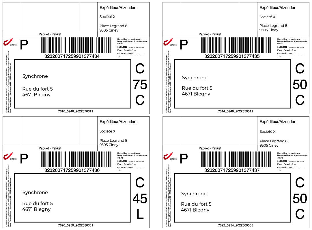 Voici un exemple anonymisé d'étiquettes à placer sur les colis. S'il y a plusieurs étiquettes le PDF généré en dipose 4 par feuille, et non une unique comme précédemment, afin d'éviter le gaspillage de papiers et simplifier la procédure.