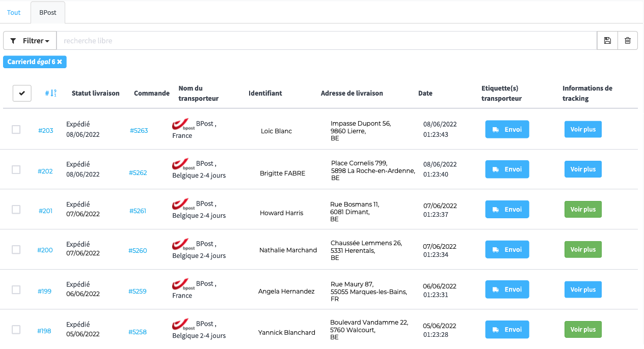 La vue sur l'ensemble des colis permet au client de sélectionner d'un seul coup le groupe de commandes devant partir dans un même camion et de générer leurs étiquettes. De plus, la dernière colonne, "informations de tracking", permet d'être tenu informé du statut de chaque colis (exemples : gris = colis créé mais pas encore d'infos relatives à celui-ci ; bleu = en cours ; vert = arrivé à destination et rouge = erreur auprès du transporteur - colis perdu, endommagé,...).